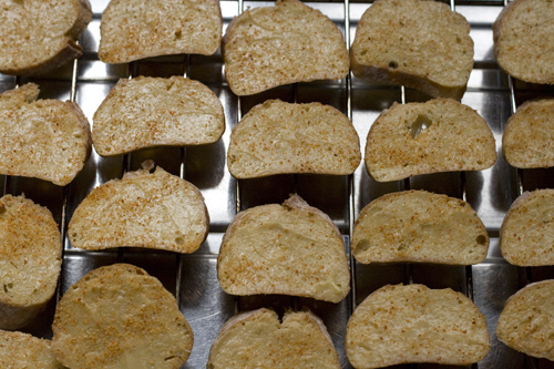 天板またはオーブンラックに重ならないように切ったバゲットを並べ、120度のオーブンで15分程度焼いて冷ます。